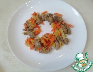 На тарелку по кругу выложить печень, смешанную с морковью и луком