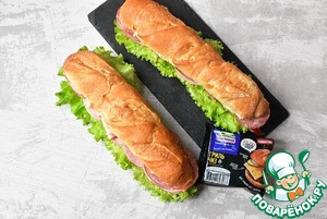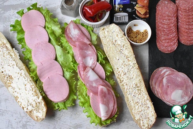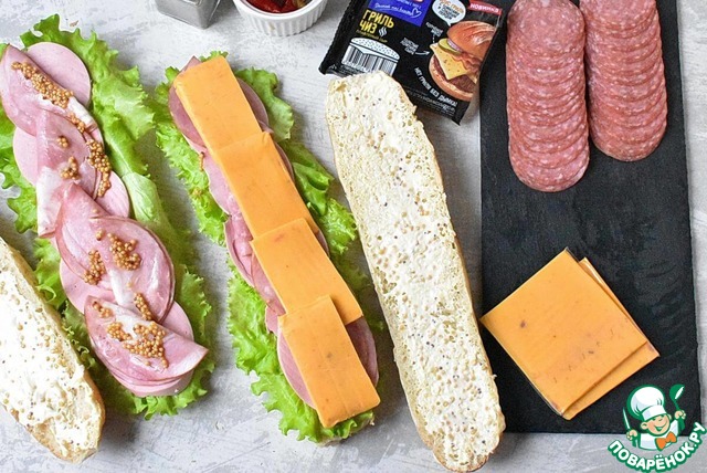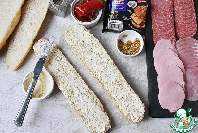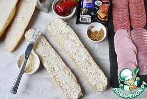 1. Багеты разрежьте вдоль. Смешайте майонез с ложечкой зерновой горчицы и смажьте все четыре половинки багетов.