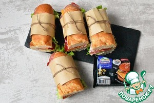 6. Хотя… ван момент, плиз!)) Еще раз разрежьте багеты на половинки, теперь уже поперек, на порции. Оберните каждую порцию бумагой и перевяжите шпагатом. Так будет удобнее есть сендвичи на прогулке или в дороге!