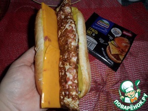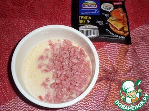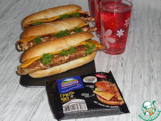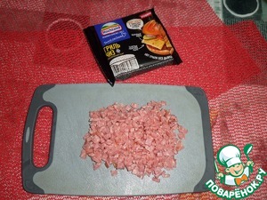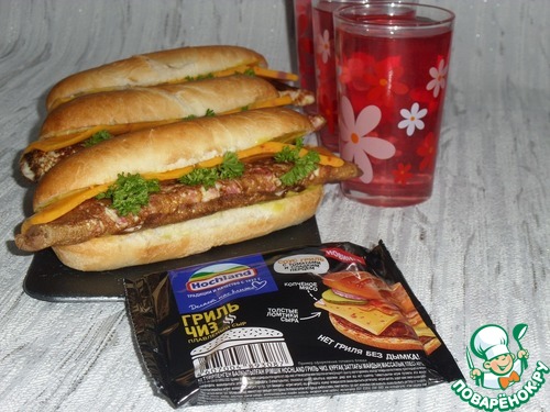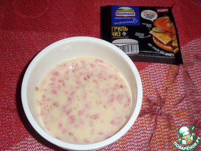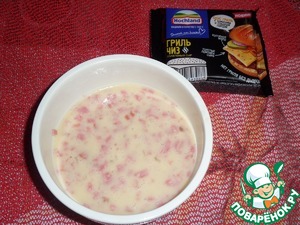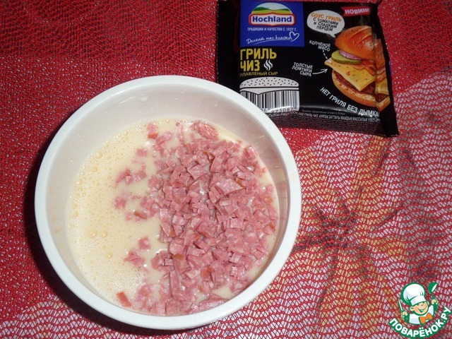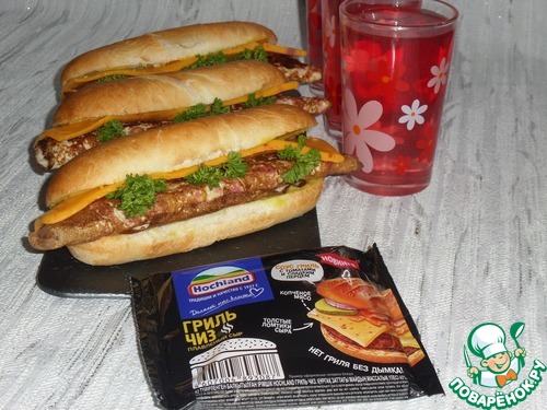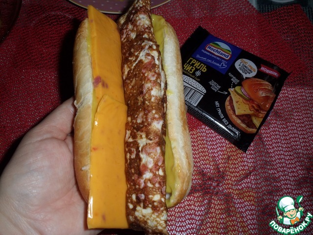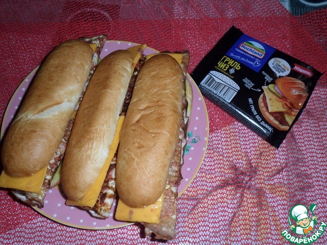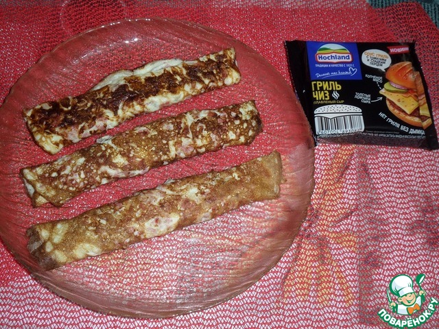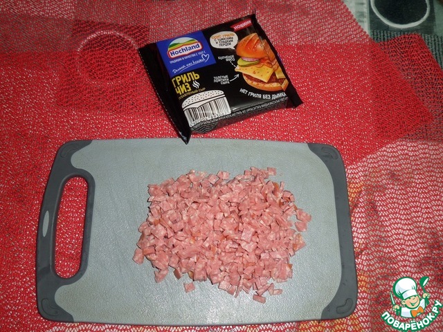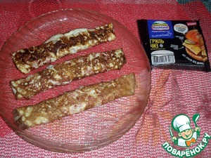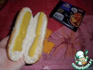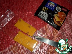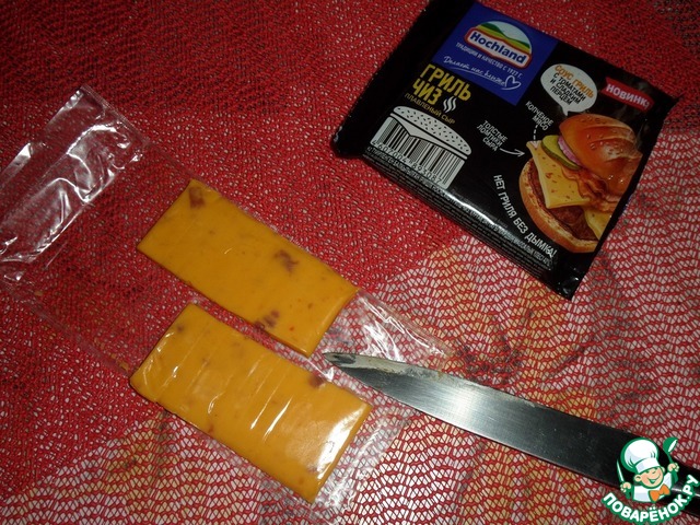 Ломтики плавленого сыра разрезаем на 2 части. Я взяла новинку - плавленый сыр "Гриль чиз" ТМ "Хохланд".