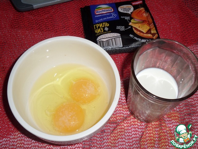 В миску разбиваем 2 яйца. Добавляем молоко и соль и слегка взбиваем.