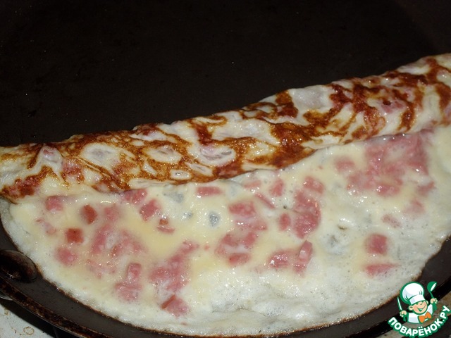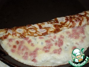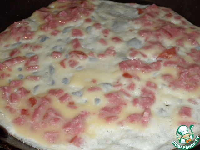Таким же образом готовим еще 2 яично-колбасных блинчика. У меня получилось 3 блинчика диаметром 22 см.