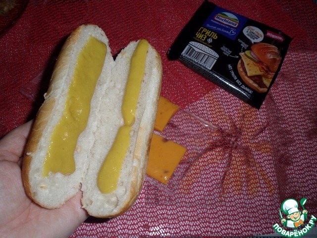 Булочки разрезаем вдоль. Каждую половинку булочки смазываем горчичным соусом.