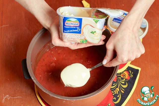 Выложить плавленый сыр и дать покипеть 10 минут, чтобы он разошелся.