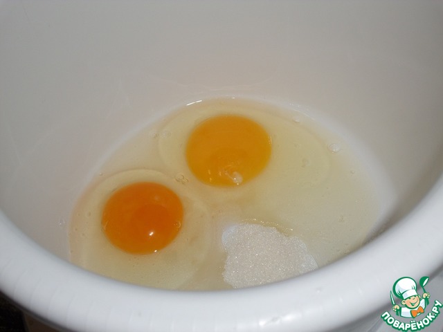 В чашу миксера разбиваем 2 яйца. Добавляем соль, сахар и разрыхлитель теста. -
