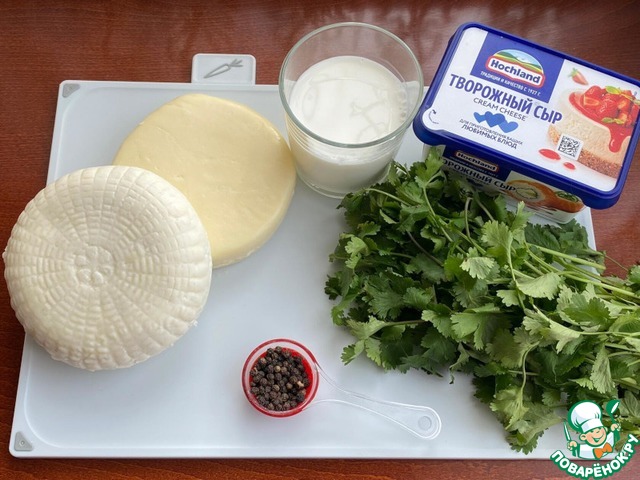 В миске смешайте три вида сыра: сулугуни, адыгейский и ТМ "Хохланд" Творожный", нашинкованную зелень кинзы и молотый черный перец.