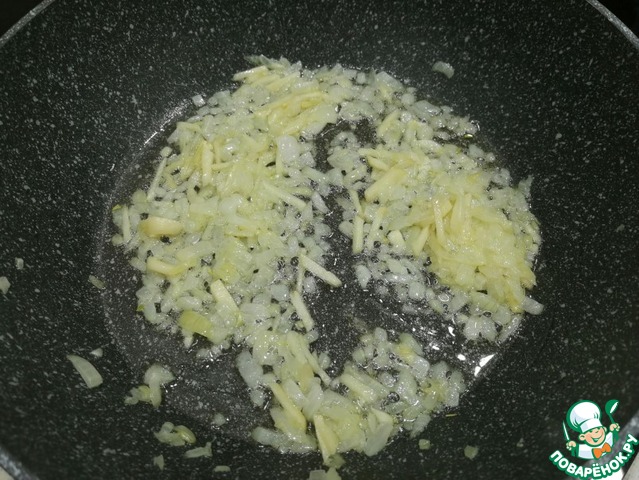 Разогреть растительное масло в сотейнике, добавить сливочное масло и обжарить лук и чеснок при слабой t ~ 8-10 мин. Они скорее томиться должны, приобретая прозрачно желтоватый оттенок. -