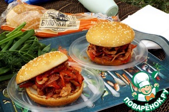 • Сверху поместить дополнительно кольца лука, ломтики сыра и верхние части булочек.