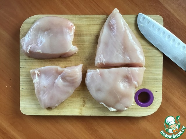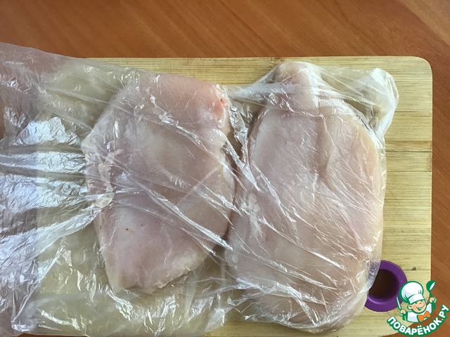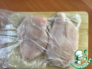 • Филе куриных грудок (среднего размера) выложить на разделочную доску, поместить в полиэтиленовый пакет и немного отбить для придания одинаковой толщины. Если не отбивать, то более тонкая часть грудки будет пересушена, а более толстая не дожарена. Кроме того, отбивание сделает мясо более мягким.