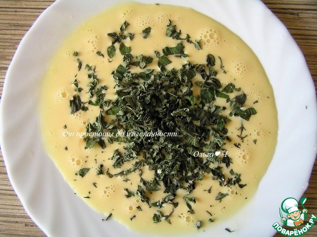 Яйцо взбейте вилкой в большой плоской тарелке вместе со сливками, добавьте нарезанные листья мяты, перемешайте.