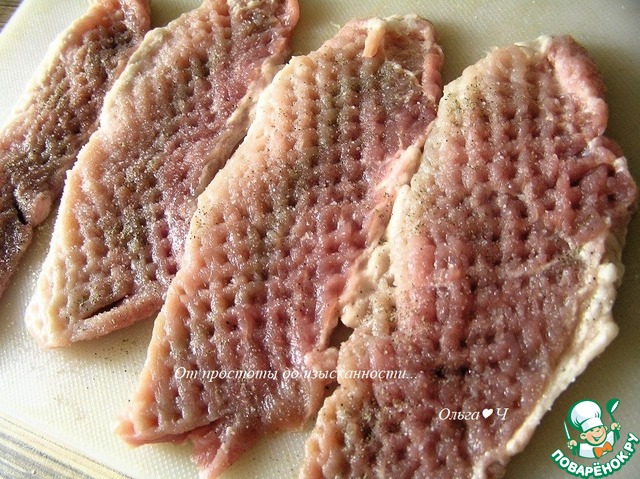 Шницели отбейте с двух сторон, накрывая пищевой пленкой (можно в 2 слоя) чтобы не летели брызги. Посолите, поперчите по вкусу.