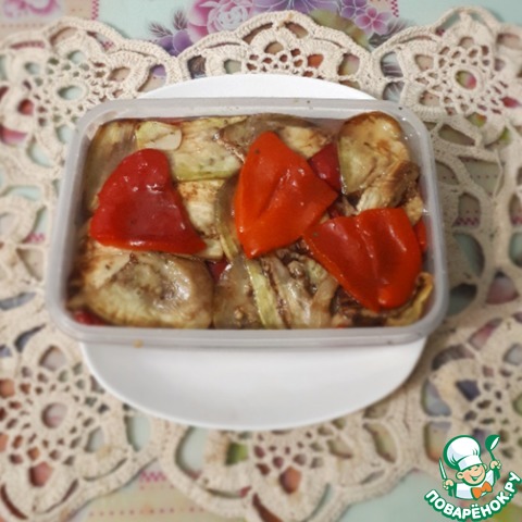 Берем пластиковый контейнер и кладем слоями обжаренные баклажаны и перцы, каждый слой поливаем немного заправкой и кладем пластинки чеснока. Если заправка осталась, то выливаем ее сверху.