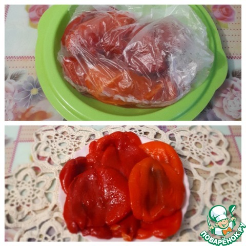 Перцы разрезать пополам, очистить от семян и запечь в духовке примерно 20-30 минут при t-200 градусов. Сложить в пакет и оставить примерно на 1 час. Очистить кожицу с перцев.