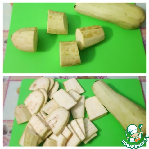 Баклажаны очистить, разрезать на 3 или 4 части, затем нарезать на тонкие (2-4 мм) ломтики. У меня вес очищенных баклажанов 400 грамм.