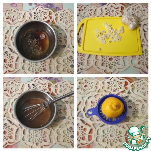 Из лимона выдавить сок, чеснок нарезать пластинками. Приготовить заправку, для этого смешать растительное масло, сок лимона, добавить соль, сахар, сухие травы ( у меня базилик и орегано), бальзамический уксус, все хорошо перемешать.