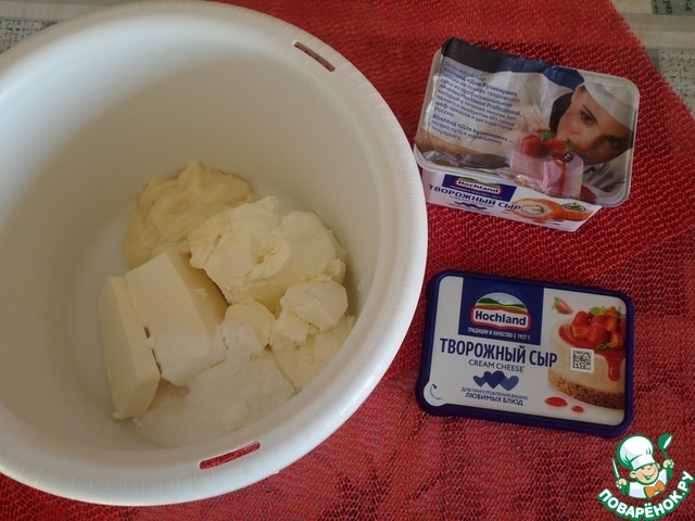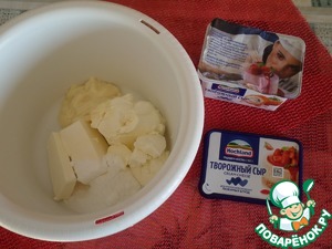 В чашу миксера выкладываем творожный сыр, размягченное сливочное масло, сгущенное молоко и сахарную пудру. -