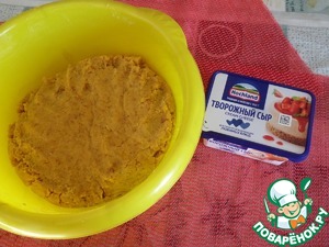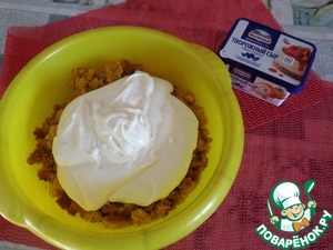 Приготовленный крем выкладываем в миску с бисквитной тыквенной крошкой.