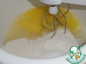 В чашу миксера разбиваем яйцо. Добавляем сахар, ванильный сахар, разрыхлитель и щепотку соли.