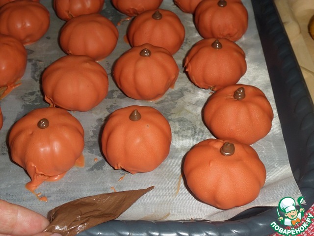 На каждую тыковку наносим немного темного шоколада - это цветоножка наших тыковок. -