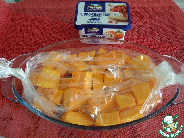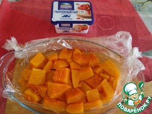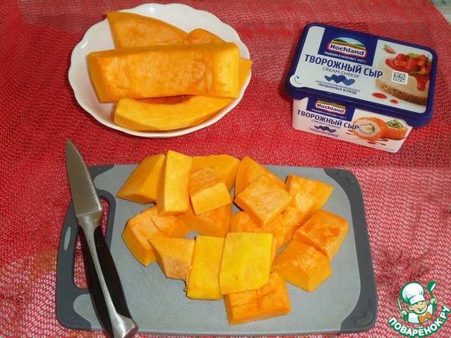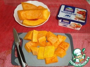 Тыкву очищаем и нарезаем кубиком. Вес очищенной тыквы - 600 гр. -
