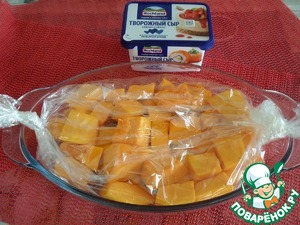 Кубики тыквы выкладываем в пакет для запекания, а затем на противень или в форму для запекания. Отправляем тыкву в разогретую духовку.