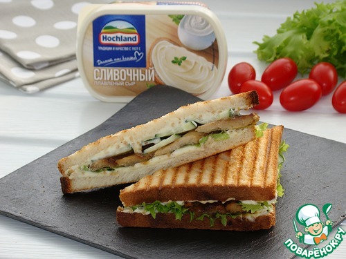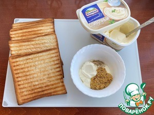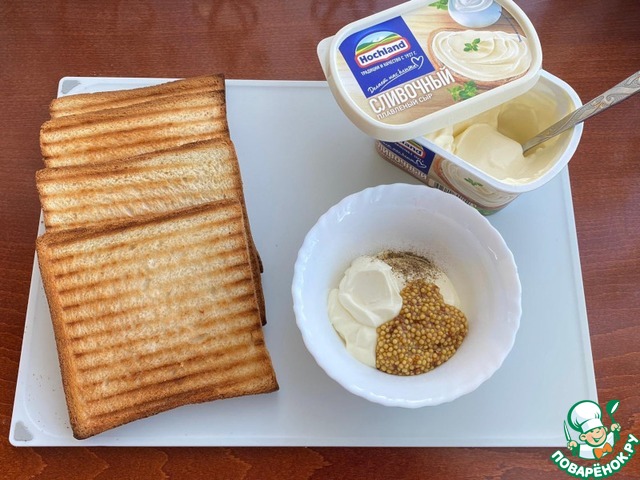 Тостовый хлеб подсушите на гриле. Плавленный сыр ТМ "Хохланд" сливочный, смешайте с горчицей и черным молотым перцем.