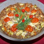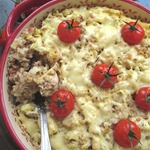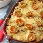 Затем вынуть форму, распределить помидоры черри и посыпать сыром, натертым на мелкой тёрке. Отправить снова в духовку ещё на 20 мин.