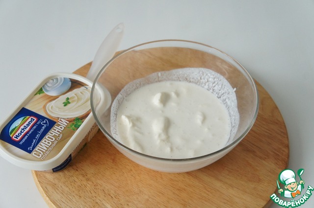 Добавьте всю ванночку 200 граммов сливочного сыра Hochland. Размешайте венчиком.