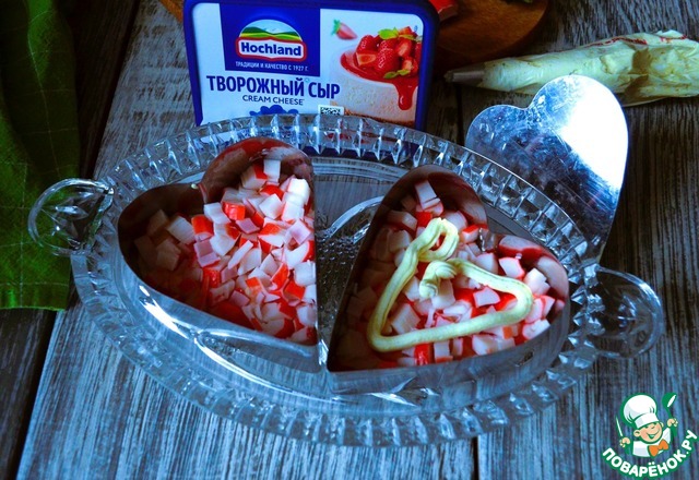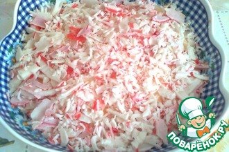 • Крабовые палочки нарезать мелким кубиком, добавить вторым слоем, утрамбовать. Добавить заправки.