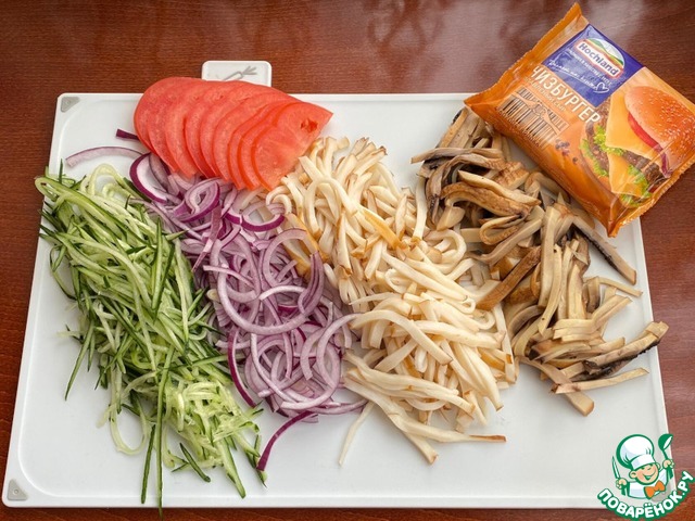 Нашинковать соломкой копченый кальмар, лук и грибы. Свежий огурец натрите на терке для корейской моркови. Помидор нарежьте на тонкие слайсы.