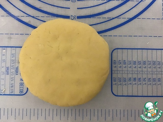 Тесто выложить-высыпать на рабочую поверхность и сформировать диск, завернуть в плёнку и убрать в холодильник для охлаждения минимум на 30 минут.