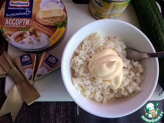 Рис в посуде нужно сразу промазать майонезом. Мы будем формировать заготовку туловища дракончика, на которую будем выкладывать слои салата. Промазанный рис не будет разваливаться.