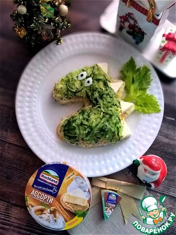 Вот такой вот Зелёный Дракон. Делайте, у Вас получится! Салат можно придумать свой. Важно, чтобы в ингредиентах был сыр в треугольниках и зелёный огурец.