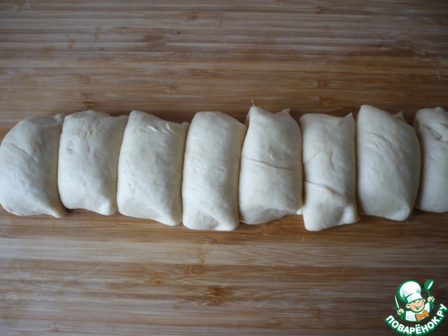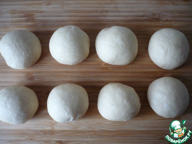 Тесто подошло, его нужно обмять и разделить на кусочки примерно весом по 80 грамм (у меня получилось - 8 штук)
