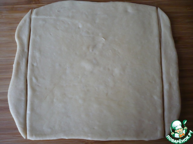 Теперь берем шарик теста и раскатываем его в форме прямоугольника. Края прямоугольника обрежьте с двух сторон как на фото. Остатки теста скатайте в шарик и на время отложите в сторону.