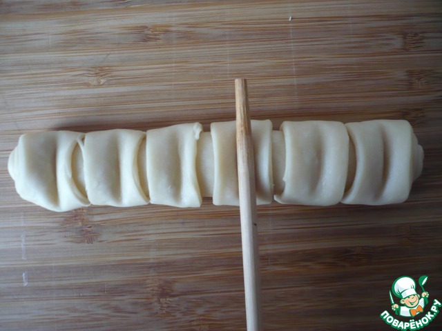 Сверните в рулет оставшуюся часть теста. На разрезанных полосках с помощью деревянной палочки продавите полоски.