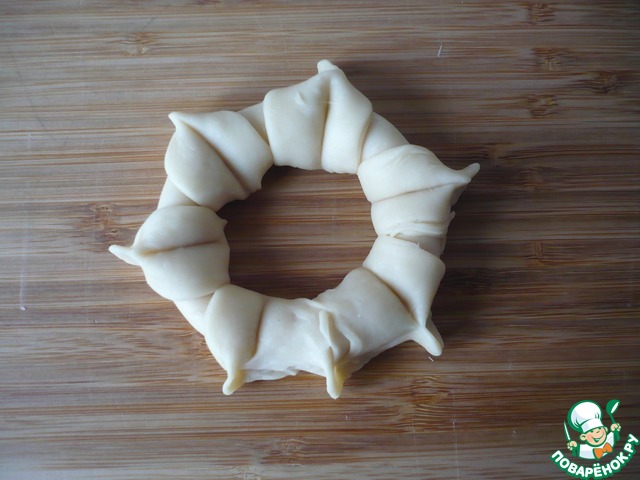 Рулетик сверните в форме бублика, скрепите концы. Каждую полоску теста защипните между собой (в виде лепестков).