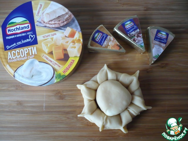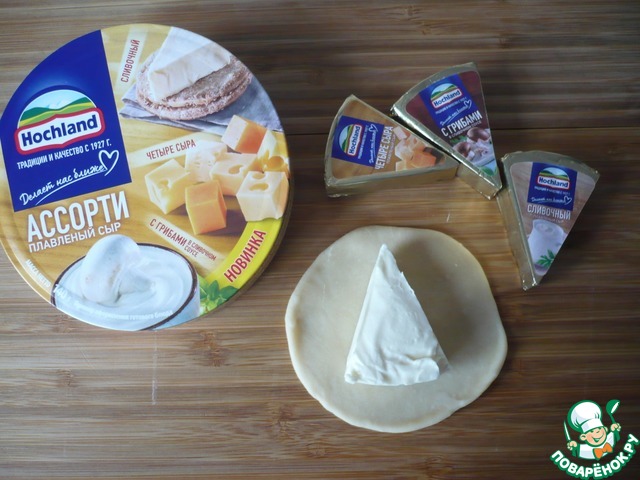 Раскатайте в кружок (отложенный в сторону кусочек теста) и выложите на него сырный треугольник плавленого сыра "Ассорти" ТМ "Хохланд", защипните края теста и придайте ему форму шарика.