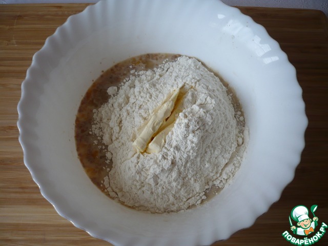 Затем всыпьте просеянную пшеничную муку и добавьте сливочное масло. Замесите тесто.