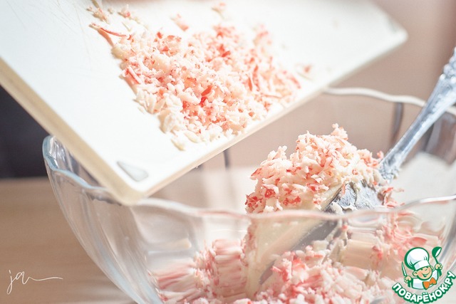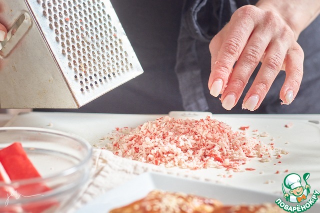• Для начинки натереть крабовые палочки на мелкой терке.