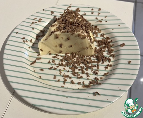 Перед подачей выложить десерт на блюдо, посыпать измельчённым шоколадом, миндальными лепестками или какой-нибудь другой декоративной посыпкой. Нарезать на порции и подать к столу.