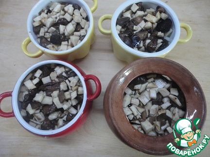 В каждый горшочек насыпьте по 2 столовые ложки промытой крупы, уложите грибы с сельдереем.