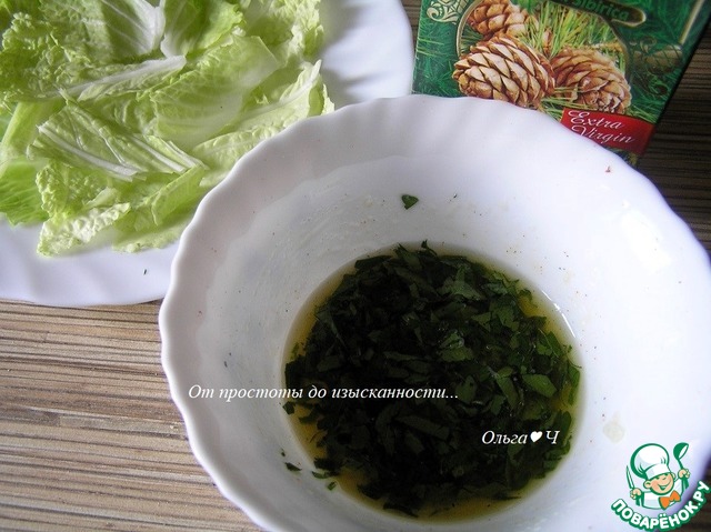 Листья капусты порвите руками, разложите по тарелкам. Для заправки смешайте апельсиновый и лимонный сок с ореховым маслом, щепоткой перца чили, солью и черным перцем по вкусу.
