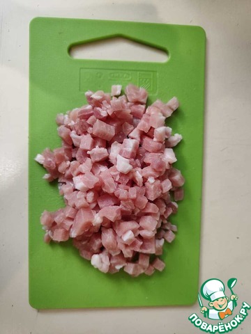 Мясо, у меня свиной карбонад, можно взять абсолютно любое мясо. Немного подмораживаю, чтобы легче было нарезать. Режу мелким кубиком по 0.5 см и отправляю в миску