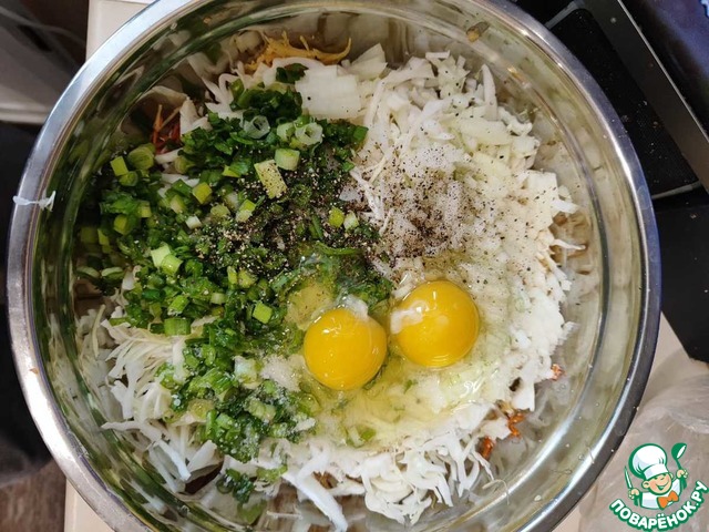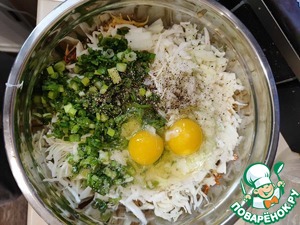 Картофель, морковь тру на мелкой терке, (между крупной и кашеобразной), капусту очень мелко и тонко шинкую, лук репчатый мелким кубиком, лук зелёный колечками, туда же отправляю сырые яйца, соль и перец по вкусу.