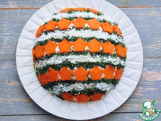 Укроп промыть, обсушить, мелко нарезать. Разложить укроп рядом с морковными звездочками, тонким рядочком. Убрать в холодильник на 1-2 часа, чтобы салат пропитался.