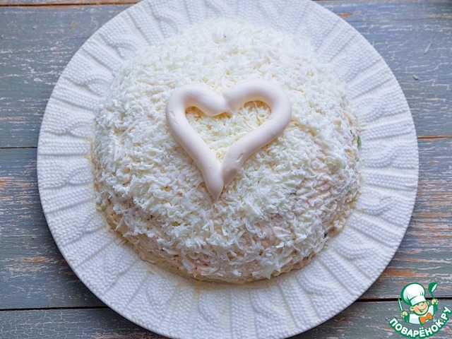 Затем натереть сыр на мелкой тёрке, смазать майонезом.