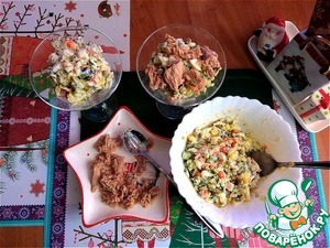 Салат заправляем непосредственно перед подачей, т к мы используем сметану. Заправляем его полученной заправкой и по вкусу солим. Попробуйте, можно добавить в заправку ложечку масла из-под тунца. Подавать я буду салат красиво и празднично в бокалах для Мартини. Из этого количества салата получится 4 бокала. Баночка тунца уйдёт вся из расчёта: четверть банки - на один бокал. Выкладываем в бокалы салат, сверху аккуратно укладываем кусочки тунца.