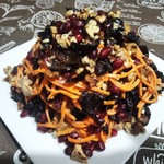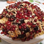 4. На плоское блюдо кладу по кругу говядину с морковью, сверху посыпаю зернами граната, нарезанным черносливом и немного орехами, сверху кладу оставшееся мясо с морковью и посыпаю оставшимися зернами гранта, черносливом и орехами.