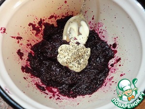 Свеклу очистить и измельчить блендером до состояния пюре. Добавить майонез, соль, перец.